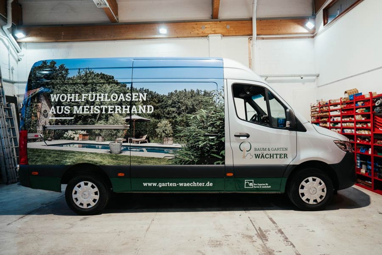 Diesen konzipierten wir nach CI-Vorgabe und realisierten die Vollverklebung mit Einblick in traumhafte Gärten.