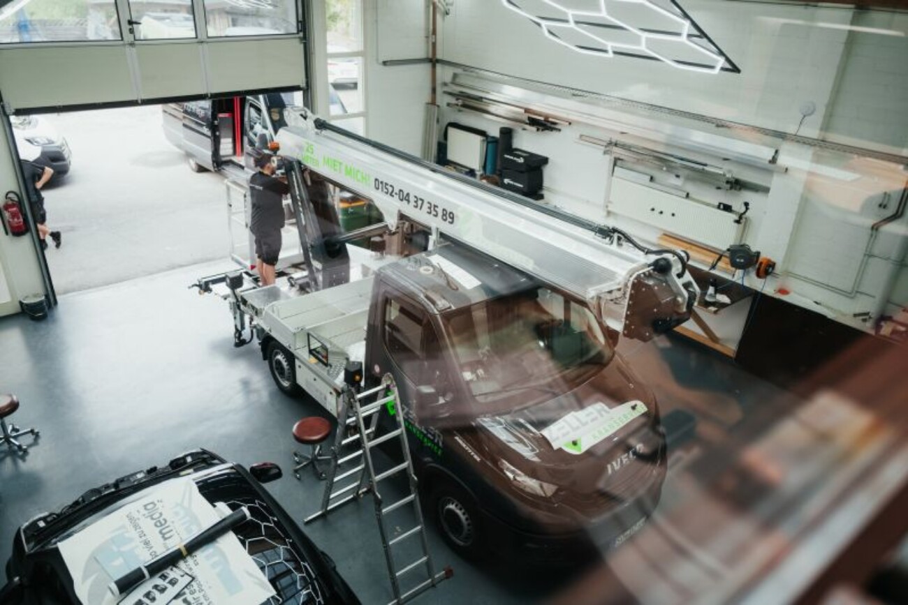 In unserer Werkstatt an der Eckendorferstraße in Bielefeld wurde auch dieses Fahrzeug präzise und mit Liebe zum Detail foliert. Das Ergebnis: Ein Hubsteiger, der nicht nur optisch beeindruckt, sondern auf jeder Baustelle heraussticht.