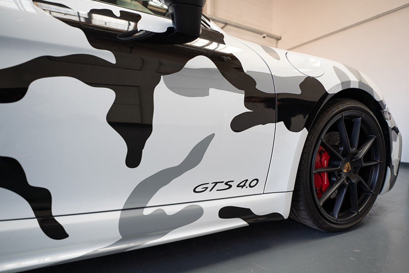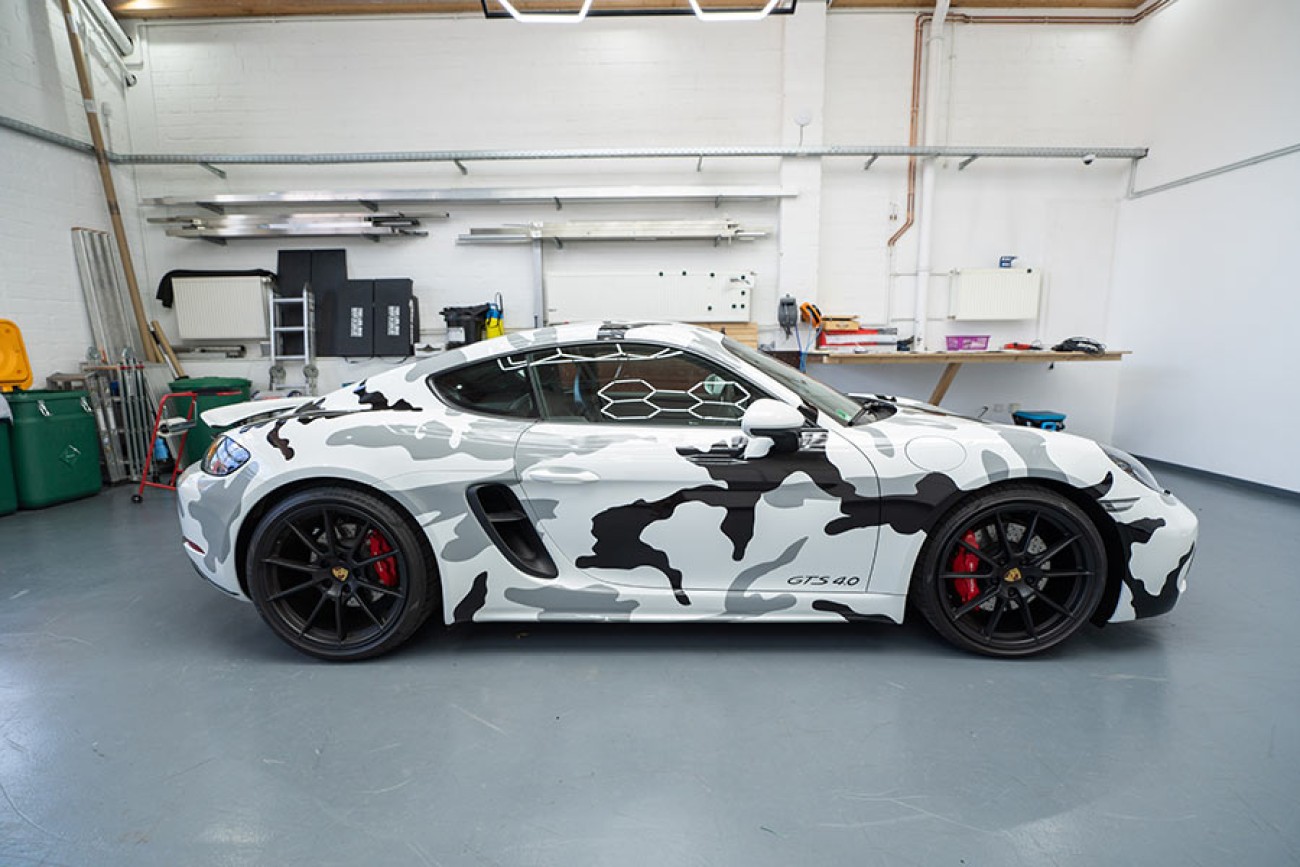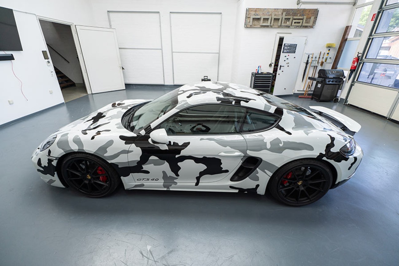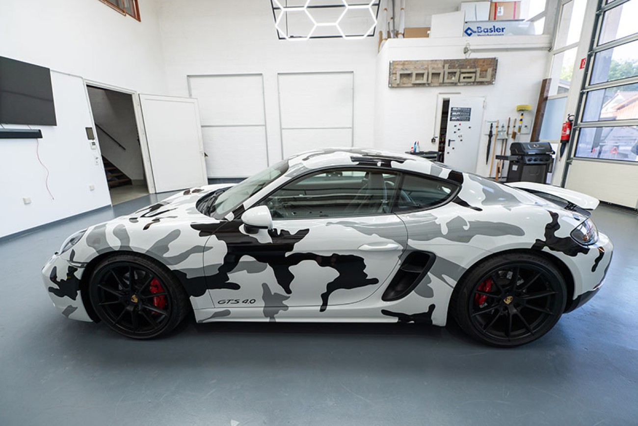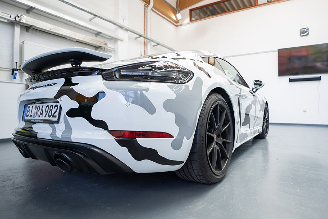 Durch die frostige Folierung in „Arctic Camouflage“ mutiert dieser Porschecayman zum absoluten Eyecatcher.
